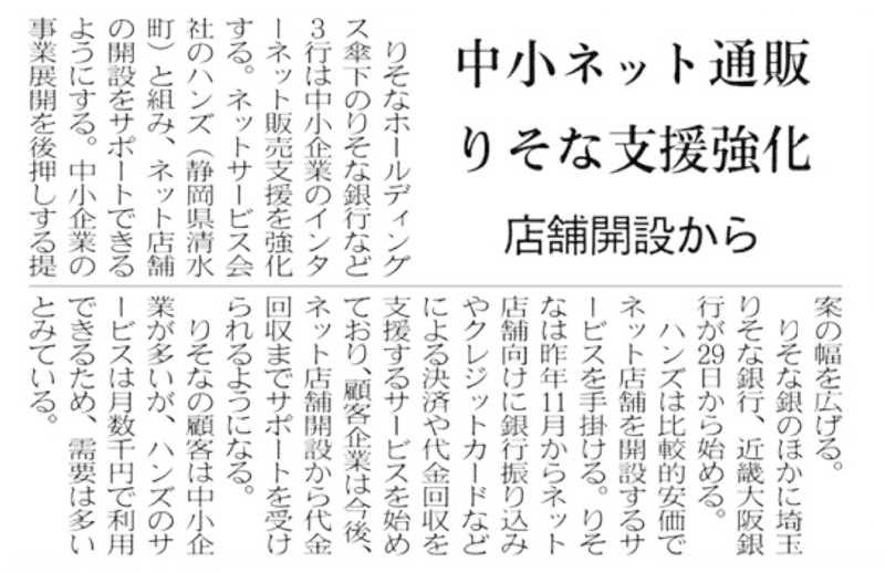 りそな銀行との業務提携により、弊社ショッピングカートサービス「e-shopsカート2」とりそな銀行の決済サービス「りそなPayResort」のシステム連動したことが、日本経済新聞に掲載されました。